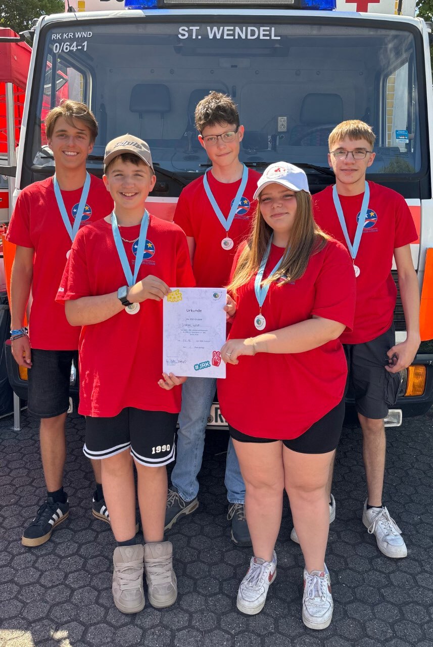 Am Sonntag, den 28. Juni 2025, kurz vor den Sommerferien fand rund um die Mehrzweckhalle in Winterbach im DRK-Kreisverband St. Wendel der Landeswettbewerb des Jugendrotkreuz statt. Das Schengen-Lyzeum nahm mit einer Gruppe von fünf Schülern teil. Evan Krotzek (9E), Bela Krotzek (7D), Ben Felten (10G), Maurice Zimmer (10G) sowie Lara Mischo (9D) stellten sich einem Parcours, in dem nicht nur ihr Wissen über Erste Hilfe und die Entstehung des Roten Kreuzes gefragt war.