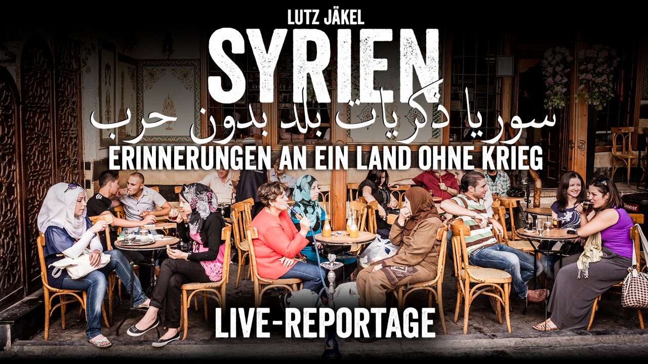 Lutz Jäkel zeigt in seiner live moderierten Multimedia-Reportage Syriens Schönheit und seine Menschen, zeitlos und lebendig, belegt die Einzigartigkeit dieser Region, zeugt von herzlichen Begegnungen, kultureller Fülle, einem meist friedlichen Miteinander der Religionen und Ethnien. Eindrucksvoll dokumentieren seine Fotos den Alltag bis 2011, zeigen, wie man in Syrien lacht und einkauft, arbeitet, betet, diskutiert und feiert. Die Erzählungen beschwören den Duft von getrockneten Kräutern in Suq, die ausgelassene Geräuschkulisse eines geselligen Abends und den zarten Wind, der über die Gipfel eines Berges streicht.