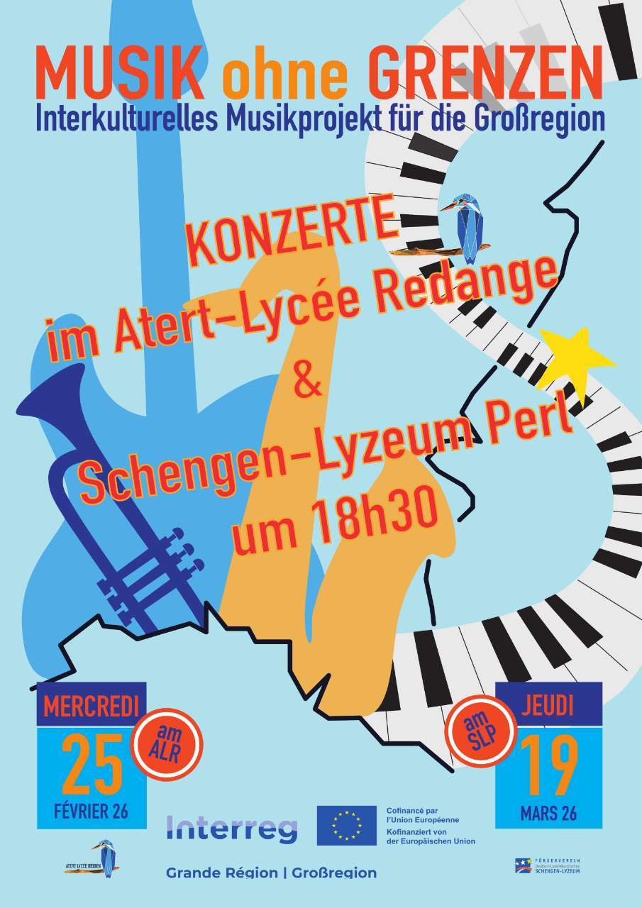 Am Donnerstag, 19. März 2026, findet um 18:30 Uhr das Konzert "Musik ohne Grenzen" des Schengen-Lyzeums gemeinsam mit Schüler*innen und Lehrkräften des Atert-Lycé Redange (LU) im Auditorium statt, der Eintritt ist frei.